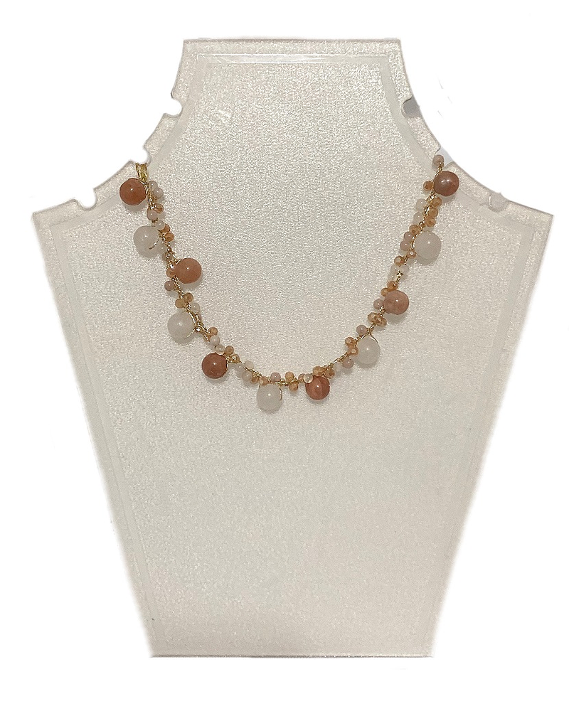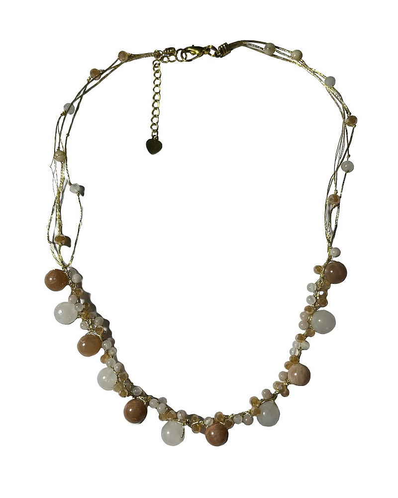 Collar que presenta piezas hiladas en hilo de seda dorado con terminación de cadena dorada.  Las piedras combinadas son Jaspe café y Cuarzo.  Su cuidado: se recomienda no golpearlo (por las piezas de Nácar), evitar los químicos, los productos que puedan dañar las piedras o el agua caliente.